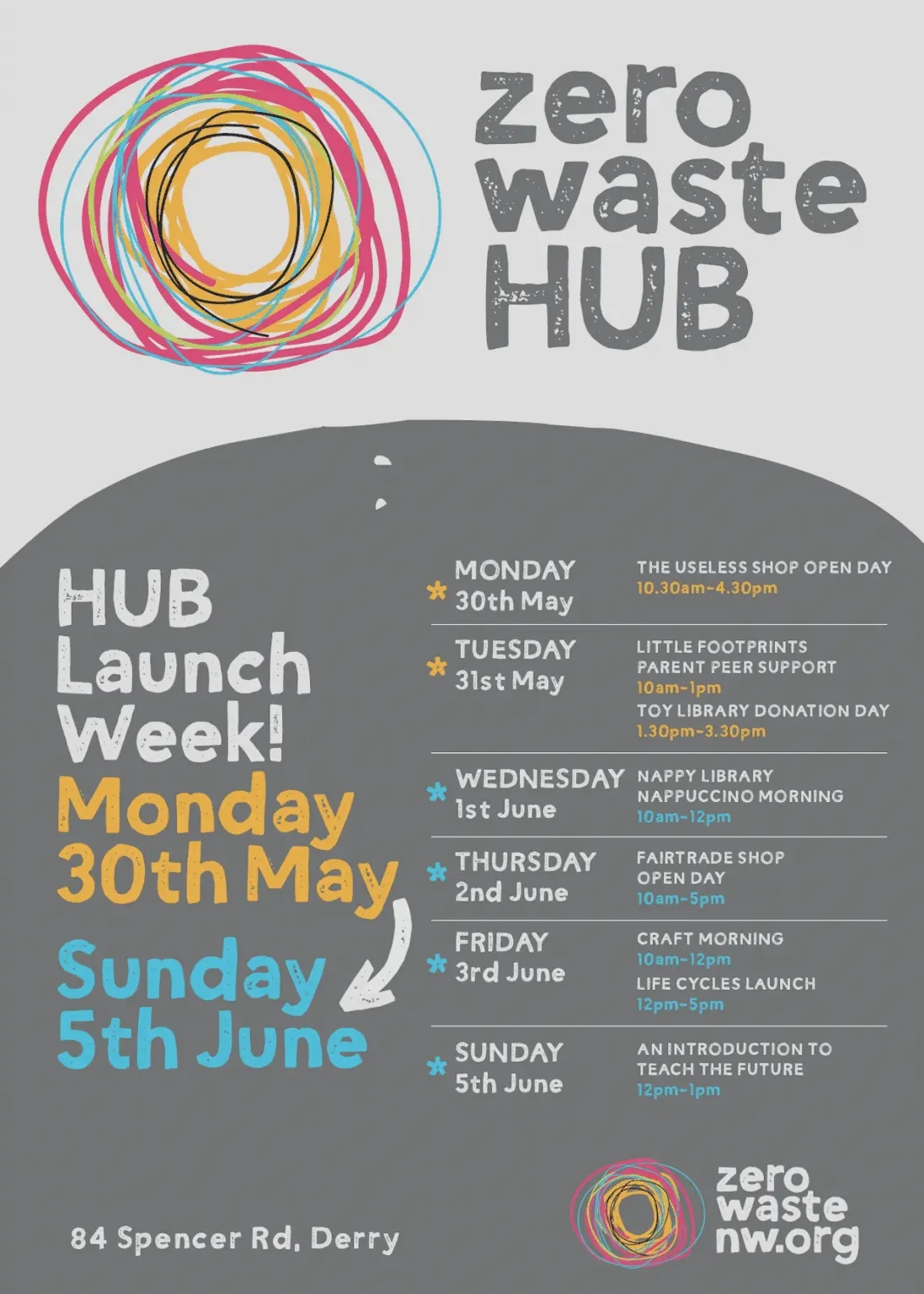 This coming Monday 30 May sees the long awaited formal launch of the Zero Waste Hub, 84 Spencer Road. A quiet revolution has been gathering momentum. It manifest with us taking on a city centre premises in December of last year and since then many more local citizens have been benefiting from all the activities that have been happening there. Now we are ready to formally launch the HUB. (See below for details)