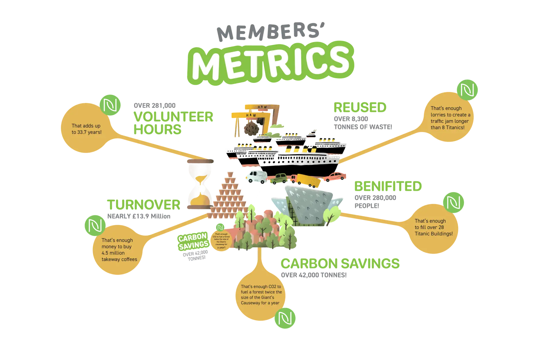 Each year, we gather data from our members to capture the full impact of their activities across environmental, social, and economic areas. This information demonstrates the collective contribution of NIRN members to the reuse, repair, and circular economy sector in Northern Ireland.