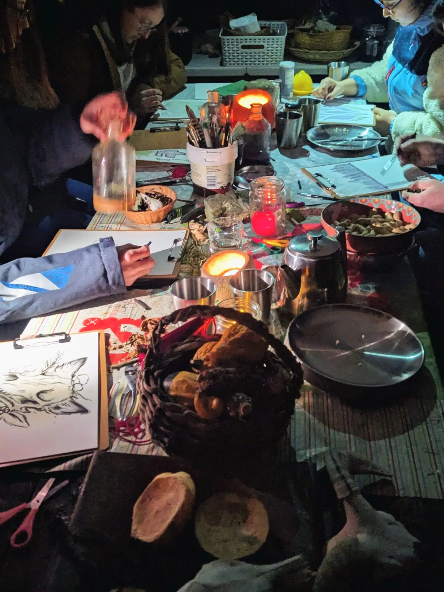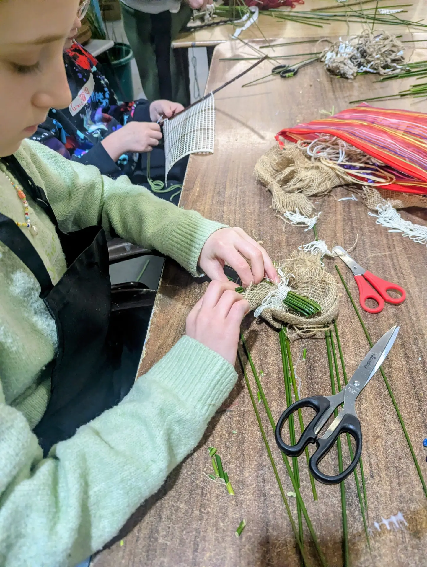 Gathering donations from friends/ families/ businesses of cardboard, fabric off-cuts, plastic tupperware, bottles, glass jars, plastic cutlery, straws, tubes, fruit netting, parcel packaging, waste giftwrap, newspapers, etc, with which to store homemade paints/ glue/ pigments/ materials and for use in creative arts and crafts sessions.