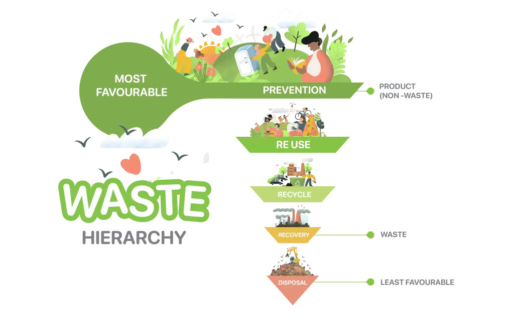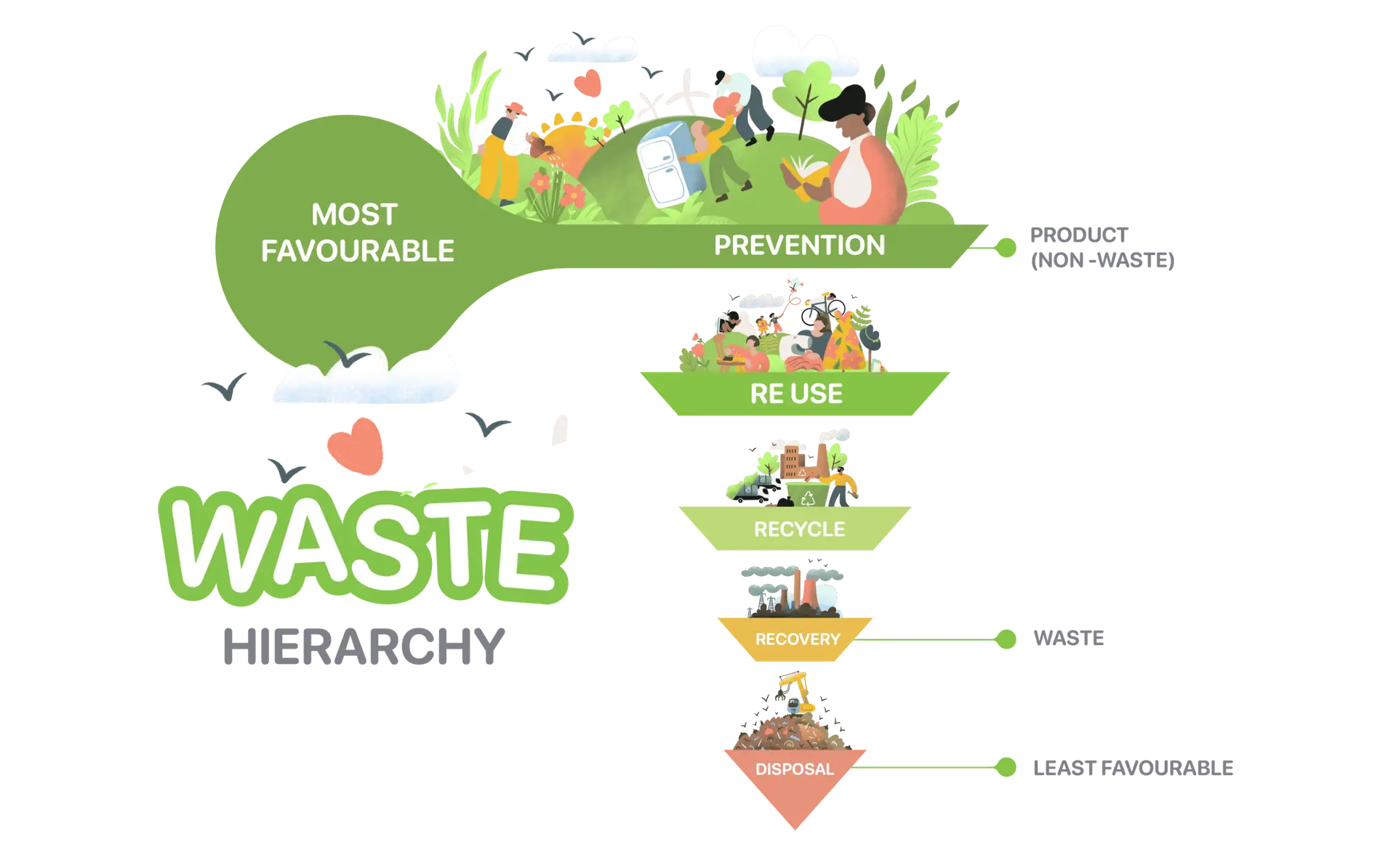 The Circular Economy Waste Management Hierarchy ranks waste according to what is best for the environment and gives priority to preventing waste. The challenge is to encourage a move from the lowest part of the hierarchy, from disposal and energy recovery where most waste currently sits and and move up the hierarchy.